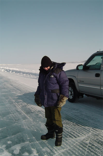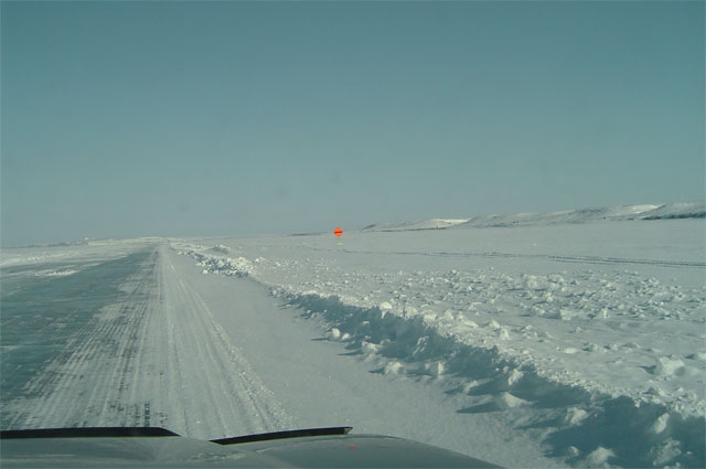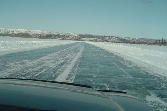 Most of the road is on the Mackenzie River, but about 100 kilometres are actually on the Arctic Ocean. When on the ocean section of the road one must watch out for pressure ridges and to a lesser extent cracks where the ocean ice is moving.