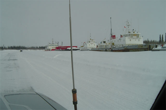 On the shore side of the ice road - tugs and supply ships frozen in for the winter.