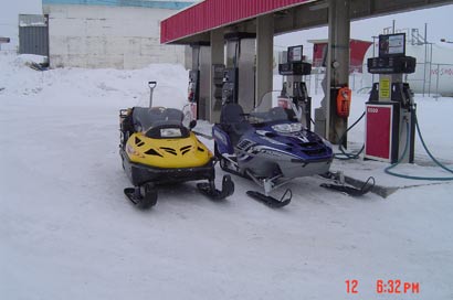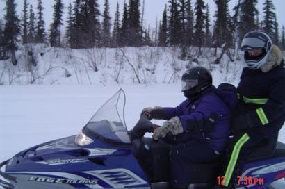 The second interesting thing was to get into an "overflow". On the snowmobile the snow looks normal but under the snow water has been seeping through the ice. The water on top of the ice can be a few feet deep. So when we hit these overflows our snowmobile became a poorly performing boat. Even at full power it was sluggish, unsteerable and wanted to sink. We were on a big bend in the River when we hit our first overflow, and it took a while to figure out how to make the snowmobile go where we wanted it to go - drive it like a boat - Jan and I both leaned over as far as we could (shoulders nearly touching the surface) and with the machine nearly on its side we slowly got it to turn and go where we wanted...