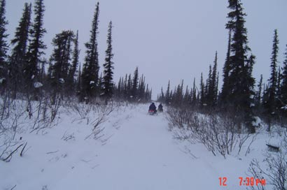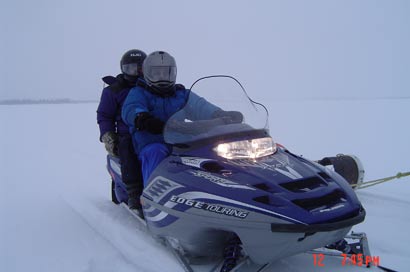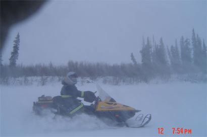 After the party, Jan and I decided to spend some quiet time at a friends winter camp. A big thank you to the Fehr family! It is a short trip by snowmobile from Inuvik across a portion of the Mackenzie delta. Sometimes we were driving on sections of the river or lakes and sometimes there is a "portage" between the river and lakes. We had a couple of interesting experiences on the trip to and from the camp. We got into a "ground storm" where the snow was blowing at ground level and it was hard to see straight ahead and there was absolutely no definition to tell if you were going up, down or into bumps or holes in the snow.